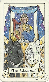 Robin Wood’s gentle chariot glides along in perfect balance and harmony. Black and white unicorns (reminding us of the Triumph of Chastity) with silver and gold harnesses face away from each other; but unlike Plato’s horses, they don’t endanger the chariot by pulling in opposite directions. The yin/yang symbol on the front of the chariot conveys the card’s essence— a balance of solar and lunar energies. As in all tarot chariot cards, the charioteer does not control the animals with reins. In this card, harmonious music keeps the unicorns balanced and working together. Rather than using the force of his will and intellect, the charioteer’s purity of soul creates an atmosphere of peace and beauty.