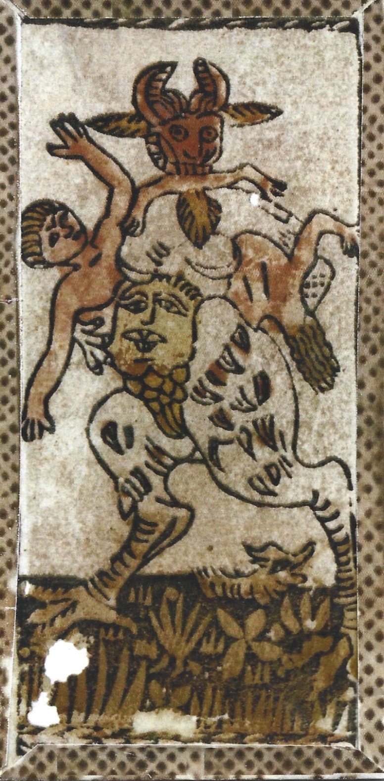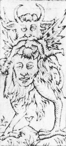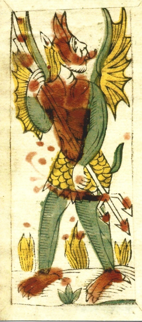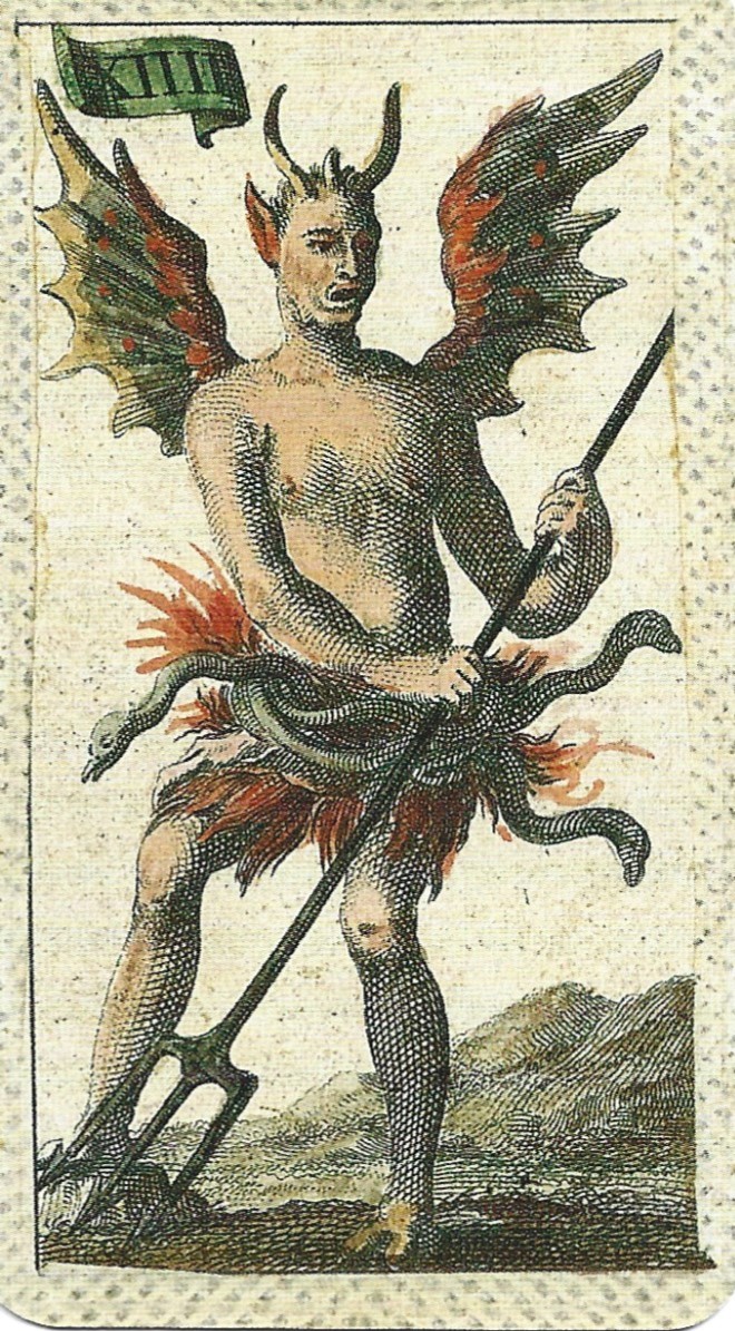The Devil as man-eating monster appears in some older Bolognese cards. These Devils have goat horns and ears. Their goat-like legs terminate in bird claws, and they have a large face in their lower abdomen, which appears in French and Belgian decks centuries later.