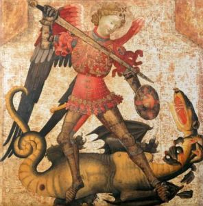 The book of Revelations tells the story of Saint Michael fighting the dragon and casting him out of heaven. Chapter 12 relates that “Michael and his angels fought against the dragon; … And the great dragon was cast out, that old serpent, called the Devil, and Satan, who deceiveth the whole world: he was cast out upon the earth, and his angels were cast out with him.” The Archangel Michael spearing a dragon was a very popular theme in medieval art which culminated in Renaissance masterpieces by Raphael, Pollaiuolo, and Dürer.