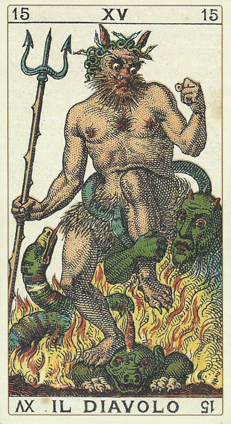 When French and Swiss tarot decks were exported to Italy in the 18th century, Italian printers copied the Devil from Besançon-style decks. Italian Devils became more goat-like, with hooves and furry goat legs. The trident that evolved into a torch in France becomes a tulip in this card.