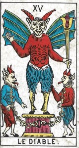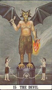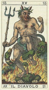 Wirth’s divinatory meanings for this card include: magic, sorcery, the power of suggestion, and the demagogue’s ability to hypnotize and dominate the masses. The Devil has the power to manifest miracles in the physical world. Since the Middle Ages, people have invoked the Devil, rather than saints, when praying for material possessions or the success of an illicit love affair. Wirth’s negative meanings for this card include greed, lust, perversion, anything illicit, as well as hysteria and lack of moderation.