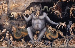 The story of Archangel Michael casting the dragon out of heaven brings us to the angel Lucifer experiencing the same fate. In medieval folklore, Lucifer is identical to Satan, and often depicted as a King Kong monster, the ruler of Hell, tormenting and eating the sinners God sends him at the Last Judgment. The Devil as a giant gorilla culminated in the Last Judgment frescos of the early Renaissance. Giotto’s Satan is typical: Satan dominates Hell as he gobbles down sinners with two mouths, one located in his lower belly. His face is hairy and animal-like, with goat horns on his head and talons for feet, but his body is smooth and nearly human. The dragons chomping on sinners remind us of the dragon cast into Hell by Saint Michael.