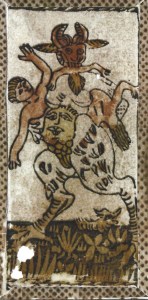 The Devil does not appear in 15th century hand-painted decks. There’s speculation these cards were omitted in courtly, custom-made decks because they were too unpleasant. But numerous cards are missing in all these early decks, so it may not be significant. It’s notable that the Milanese Visconti-Sforza deck is nearly complete except for the Devil and Tower. I believe these cards were in the original deck, but were removed later for some reason. Shown here are two examples of what the Devil card of the Visconti-Sforza deck might have looked like.