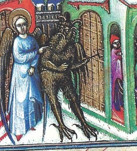Some of the earliest depictions of the Devil as tempter and tormentor are from illuminated manuscripts depicting the Temptation of Christ. The Devil in the St Albans manuscript at left has human posture, but fur on his legs, a tail, talons for feet, and animal ears rather than goat horns. His colorful wings remind us that the Devil is a fallen angel.