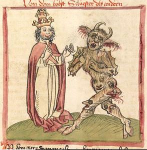 For Medieval and Renaissance Christians, anyone who was different, non-conformist, or not a Christian—Jews, Muslims, Cathars and other heretics, old women—aroused fear and suspicion because they were undoubtedly controlled by the Devil. Demonic possession was a handy tool for justifying witch burnings, crusades, and persecutions. Today, we usually don’t invoke the Devil, but demonizing people we see as “other” hasn’t gone out of fashion.