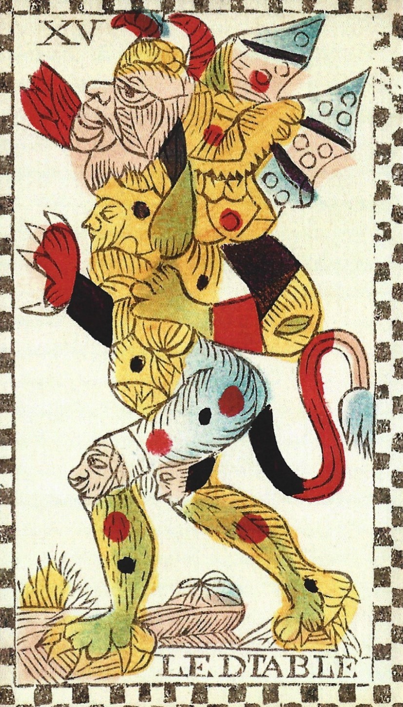 A Devil covered with eyes and faces is preserved in the 18th-century Rouen-Bruxelles tarot pattern, as well as the Jacques Vieville tarot printed in Paris about 1650. This fire-breathing Devil strides forward in profile, sporting a long tail with a tuft at the end. Faces emerge from his knees, stomach and chest. He has a furry body and bird claw feet. Two quotes from the Bible may have inspired the extra face in the stomach: Romans 16:18 advises Christians to avoid people who cause dissension because.”…they that are such serve not our Lord, but their own belly”. Philippians 3:19 lists people who are enemies of Christ, including those “whose god is their belly”.