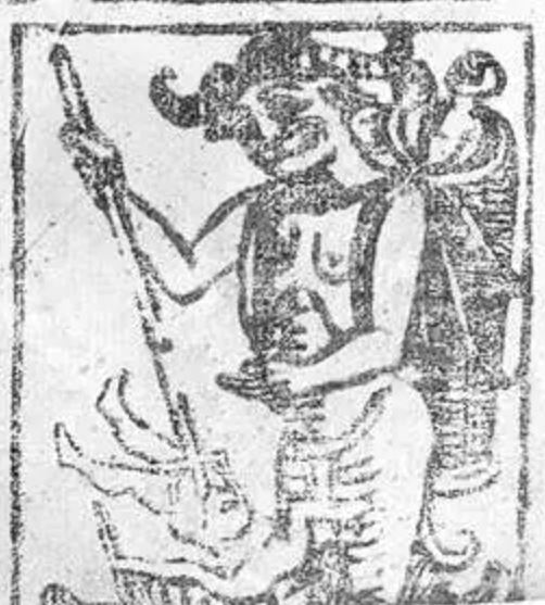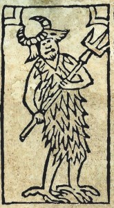 The earliest printed tarot cards depict Devils that seem mischievous rather than threatening. The face on the belly of the Budapest Devil with red angel wings might be strapped on and could be a theater costume. The Rosenwald Devil seems to be wearing a costume of leaves or badly drawn fur. Both Devils have talons and goat horns and seem rather playful and nonchalant. The Inquisition’s two-pronged flail evolved into a trident later in the century.