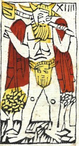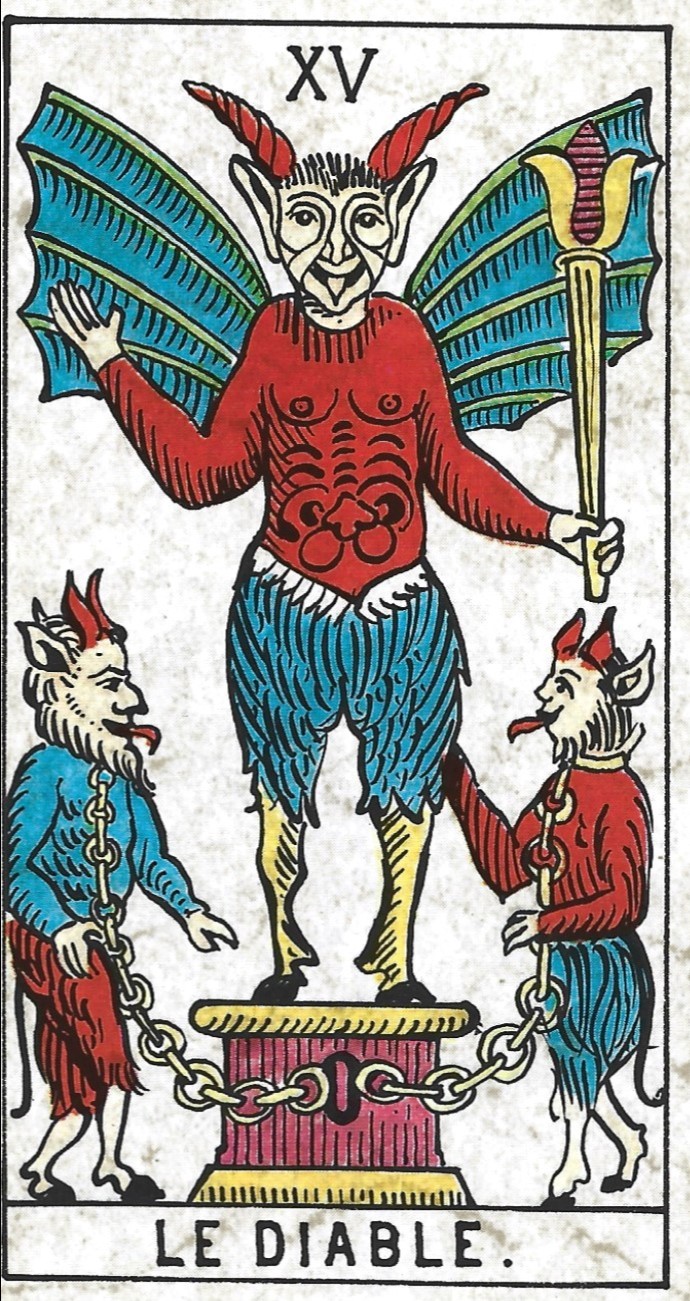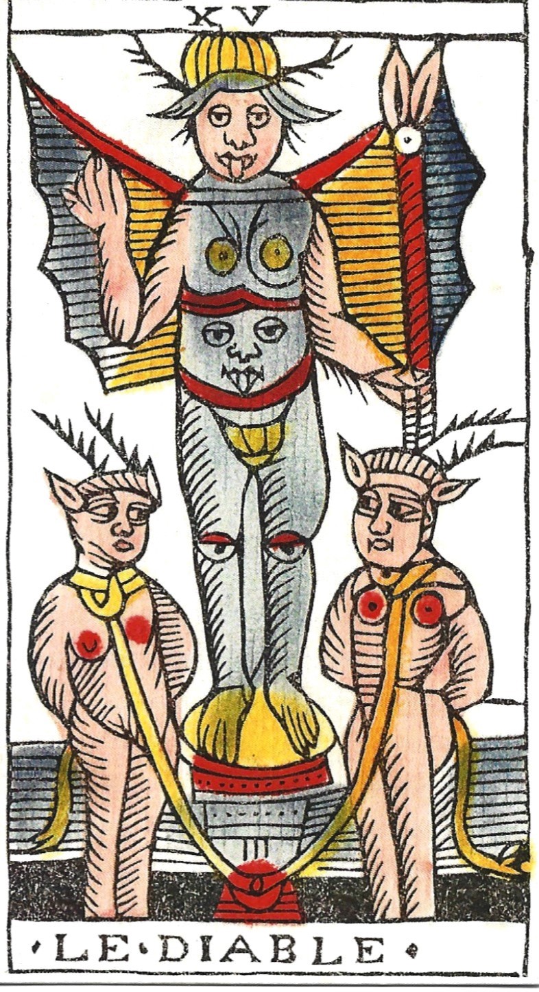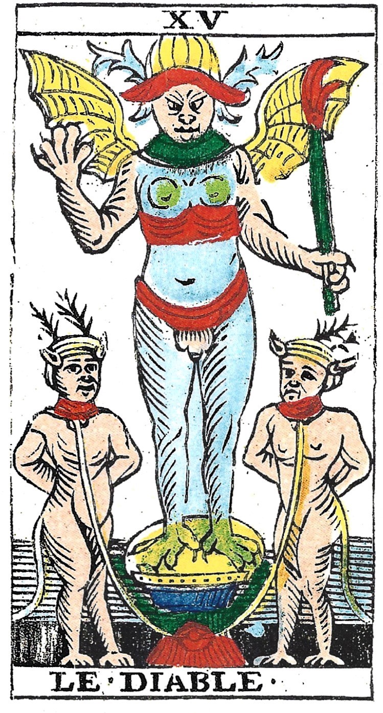 The standard Tarot de Marseille Devil has a human body without the fur and other details found in early Italian cards. Rather than goat horns, antlers seem to be attached to a cap, and the cap’s brim is folded to look like animal ears. The Devil’s tongue sticks out. The extravagantly large wings of the earlier TdM become graceful bat wings in later decks. The genitals are exposed making it clear this is a hermaphrodite with female breasts.