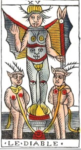Some see the Devil card as a parody of the Pope card. Both figures raise their right hands; and both have subordinates in front of them. The Pope’s triple cross is mirrored by the Devil’s torch. But it’s more likely the Devil card is a sinister version of the Lovers, where a man stands between two women who are reaching for him, as they both desire him. In the Lovers card, all three figures are the same size. In the fifteenth trump, the Devil looms over two female figures who are bound to him. The women aren’t free to leave, but they aren’t in distress, and may even be enjoying their rather degrading situation.