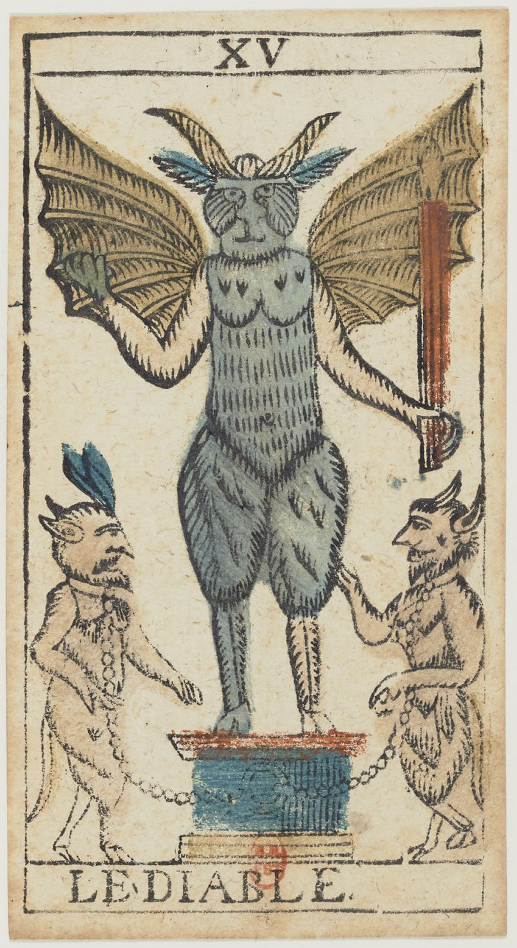 The biggest change from Italian decks is the addition of the two minions attached by their necks to the Devil’s podium. Their antlers and animal ears, like the Devil’s, seem to be attached to a cap. Both appear female. Their hands are tied behind their backs, and both have long tails.