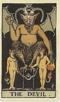 By the time Waite designed this deck, he had renounced ceremonial magic and was identifying as a Christian mystic. He tells us that Levi and the French occultists were wrong to associate this card with magic and the occult. In fact, he believed those who dabble in magic suffer from the illusion that the material world is all there is, and they will be punished. For Waite, the Devil is the “Dweller on the Threshold” who guards the entrance to the Garden of Eden after Adam and Eve were driven out.