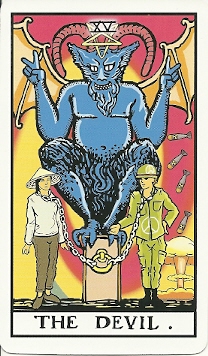 The contemporary view of this card is rather ambivalent. On one hand, the Devil is about succumbing to the lure of addictions, whether drugs, shopping, or chasing after fame. But on the flip side, throwing off repressions and occasionally indulging in forbidden pleasures can feel like liberation. The Jungian Devil is an upwelling of one’s dark side from deep in the unconscious, resulting in irrational and destructive behavior. But there’s treasure buried deep in the psyche—repressed creative energy that wants to burst free into the light of consciousness. Many decks created in the past few decades show a dark side of human nature: people gripped by unconscious forces that rob them of autonomy.