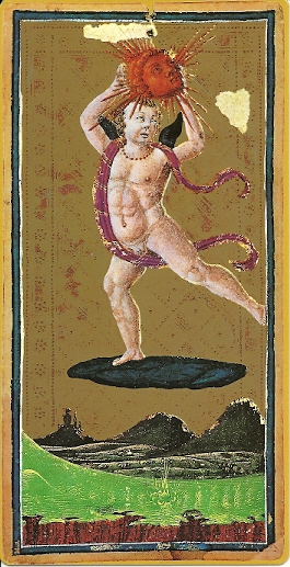 In the Budapest deck, block printed in Italy just before 1500, the benevolent Sun pours life-giving rays on a forest or orchard.  In the French Tarot de Paris, printed in Paris about 1650, a monkey holds up a mirror for a woman with very long hair. This Sun card could be an allegory of Vanity.