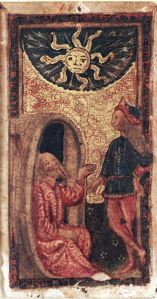 The story of Alexander the Great meeting the Cynic philosopher Diogenes was repeated in literature from the time of Plutarch in antiquity to Shakespeare in the early modern period. Diogenes modelled what he believed to be a natural, stress-free life by owning no possessions and living in a barrel. One day, Alexander visited Diogenes and asked the philosopher if he could do anything for him. Diogenes responded, “Yes, step aside please. You’re blocking the sun.” This encounter was illustrated on a Sun card painted in mid-15th century for the Duke of Ferrara.