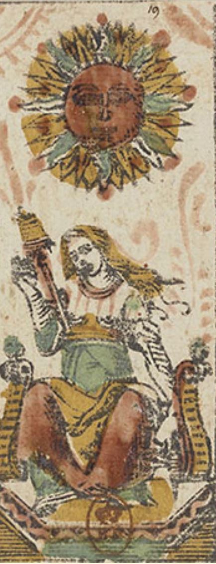 The earliest known Sun card that shows a woman with a distaff and spindle is in the so-called Charles VI deck that was painted for an Italian aristocrat in the mid-15th century. A woman carrying a spindle was a common sight in pre-modern times. Women spun yarn as they walked to market, tended their animals, or waited for the porridge to boil. The spindle became a symbol for a respectable and hard-working housewife. The revolving spindle is analogous to the Sun’s daily revolution around the earth, making the card a reminder to take advantage of the daylight to get work done. This image has been associated with Clotho, the Fate who spun the thread of an individual’s destiny.