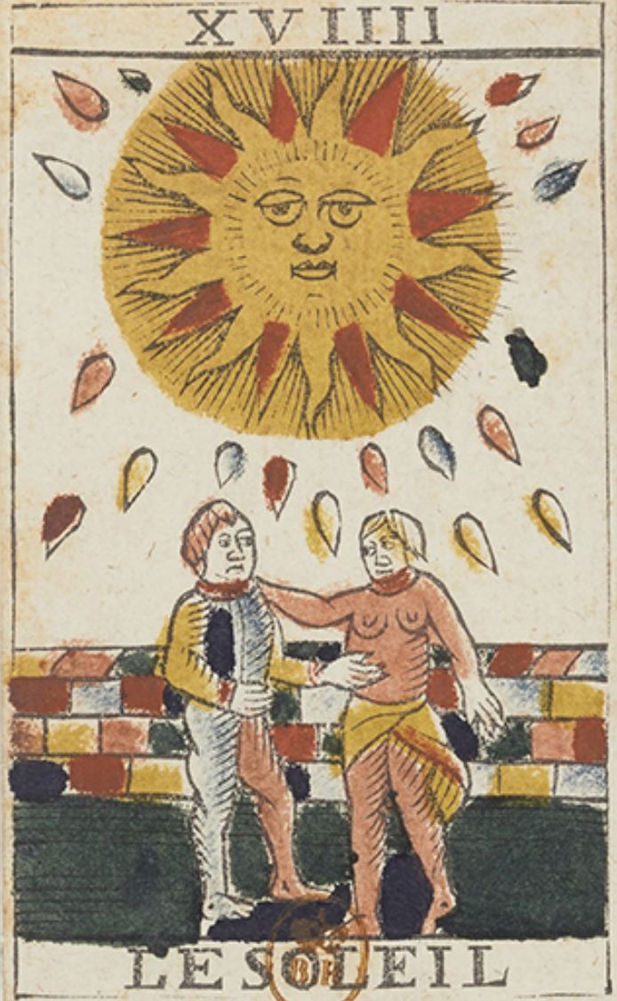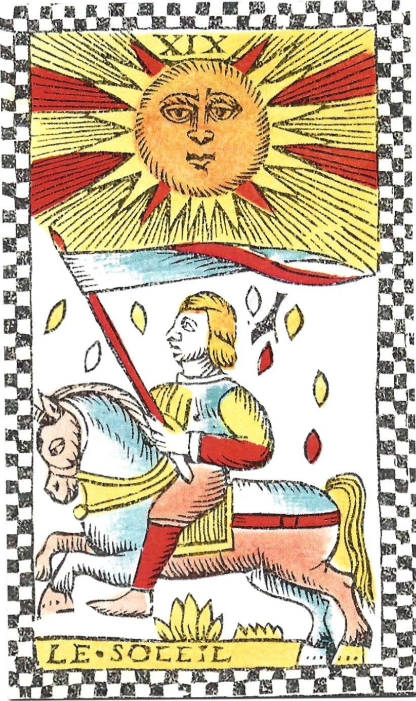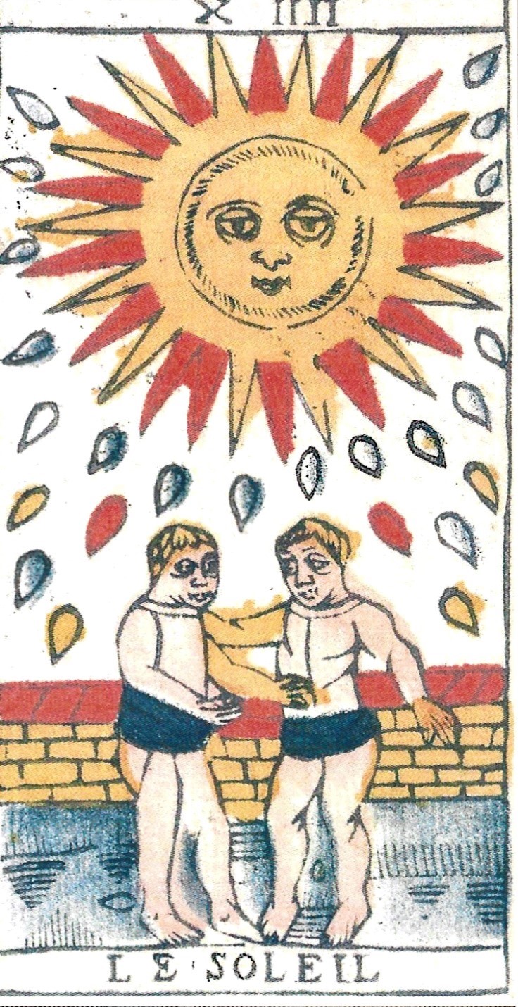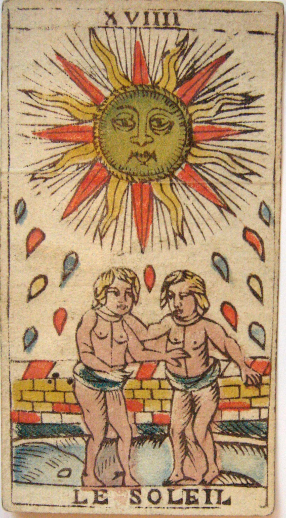 The Tarot de Marseille, which appeared in eastern France in the early 17th century, displays two children on the Sun card. This design has been the standard tarot Sun image in Europe for four hundred years; and it’s the image occultists associated with the Sun from the 18th to 20th centuries.