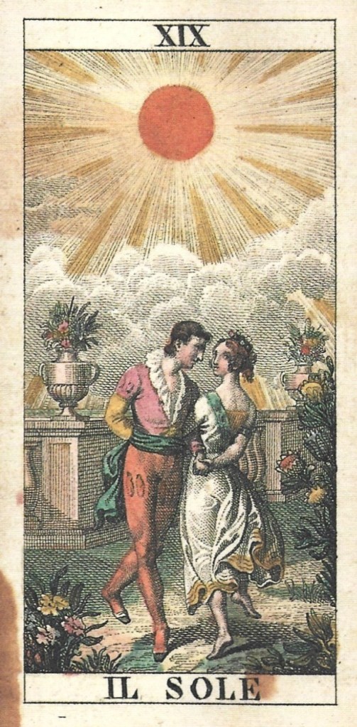 Many Sun cards show a boy and girl rather than two boys. The Noblet, one of the first Tarot de Marseille decks, might show a boy and a girl—the image is rather ambiguous. When the Tarot de Marseille became popular in Italy in the 18th century, Italian card makers adjusted some of the images to appeal to local tastes. In the Piemontese deck in the center, the couple stand rather awkwardly, like the two boys in the traditional Tarot de Marseille. The 1835 Soprafino deck by Carlo Della Rocca shows a well-dressed couple dancing in a walled garden. Card printers in Lombardy and Piedmont copied this card, as well as other tarot images by Della Rocca, throughout the 19th century.