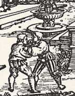 This detail is from a Children of the Sun print that shows men fencing, lifting weights, and wrestling in a palace courtyard, while people look on from upper windows. Wrestlers were always included as Children of the Sun. In better quality engravings, such as this one, the athletes are rendered very realistically. In cruder block prints, the wrestlers stand next to each other, facing forward with their arms on the other’s bodies, looking very much like the awkward boys in Tarot de Marseille decks.