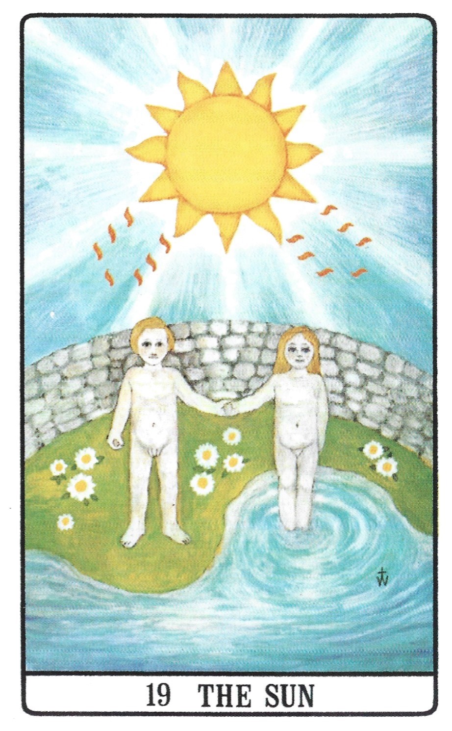 In the Golden Dawn’s deck, a naked boy and girl hold hands in front of a wall, an image very similar to the Tarot de Marseille. The boy stands on green grass while the girl stands in a pool of water. The drops falling from the sun have been changed to Yods, the first letter of God’s name in Hebrew.