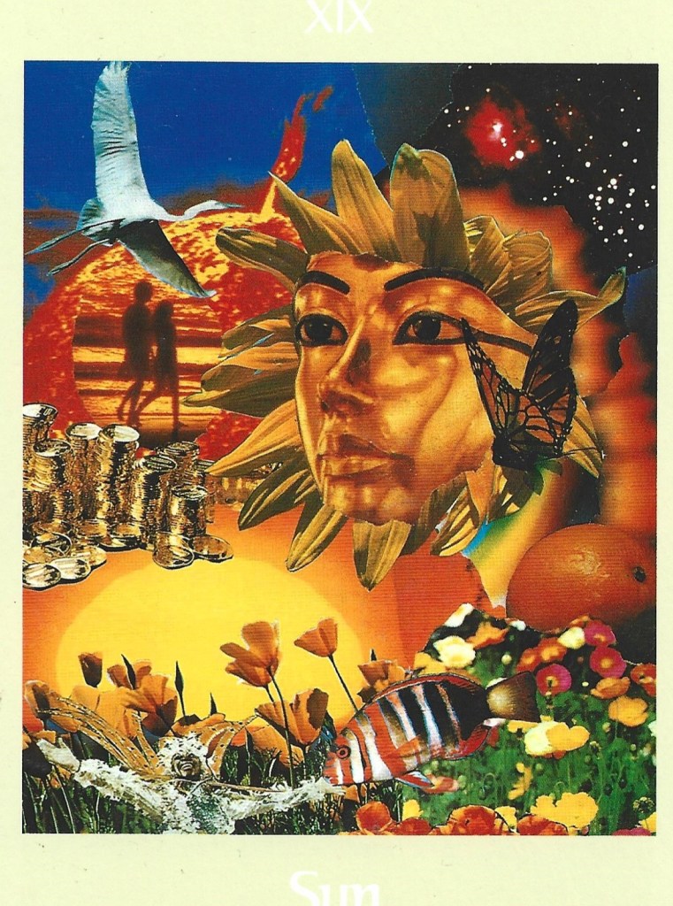 The golden mask with rays of sunflower petals on the Voyager card looks like the Visconti-Sforza Helios mask. The stacks of gold coins symbolize abundance and blessings. As a native of the golden state, California, the artist includes emblems of that state: Golden poppies, monarch butterflies, an orange sunset over the Pacific ocean, and colorful striped fish.
