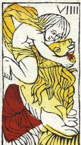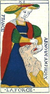 By the first half of the 17th century, the classic Tarot de Marseille pattern had been established. The Payen deck on the left was printed in 1743 using wood blocks from the Marseille based Vachie workshop of 1639. The Arnoux & Amphoux card on the right was printed in 1801. These two cards show how the Tarot de Marseille image has remained stable through the centuries. Compared to the cards above, the scene in the Tarot de Marseille deck is rather static. The woman sits calmly on a passive lion who allows his mouth to be pried open. We don’t see her feet. The crown of her hat is minimized, allowing the brim to seem like an infinity symbol.