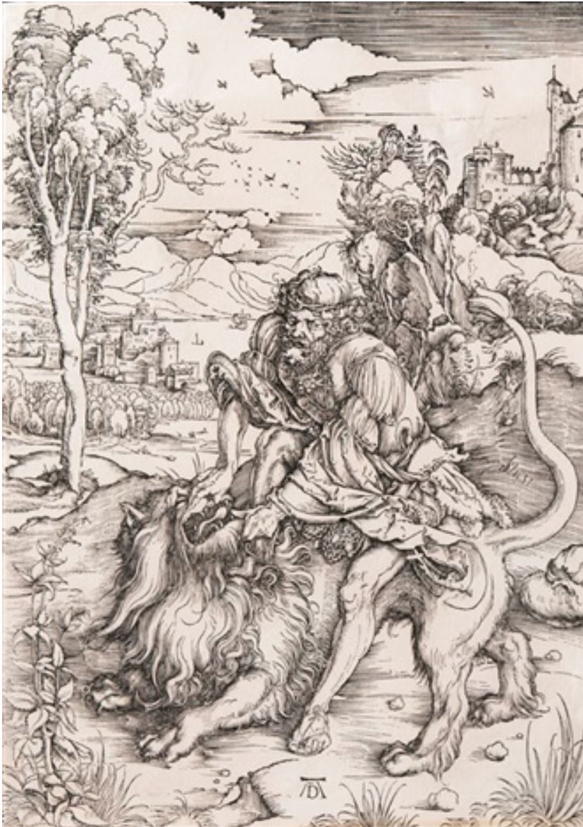 Samson Wrestling a Lion. Albrecht Durer. Woodcut c. 1500. Reproduction from an auction catalog