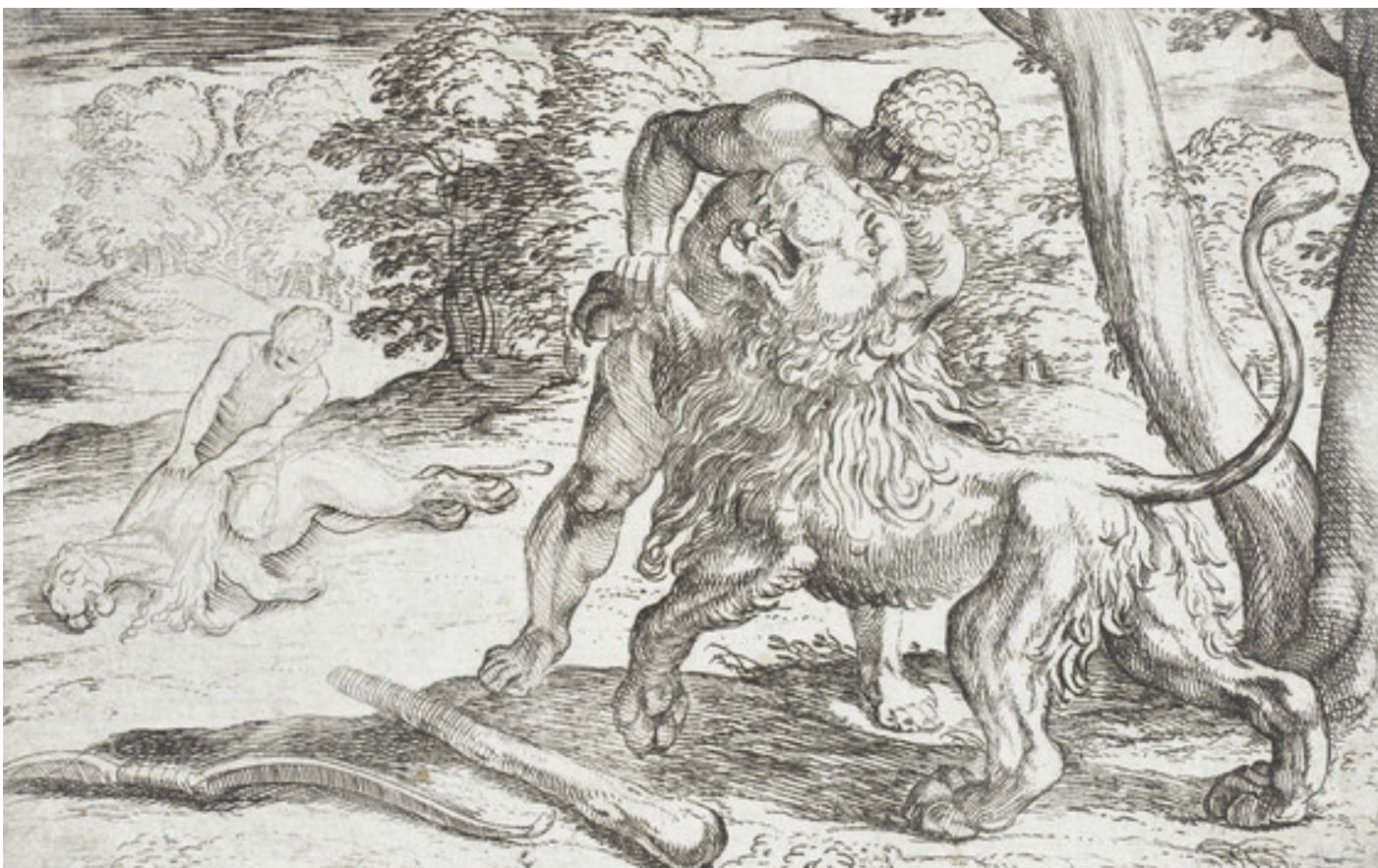 In most works of art, it’s difficult to tell whether Hercules or Samson wrestles with the lion. Often, the artist tips us off by including a distinguishing attribute, like Samson’s jawbone or Hercules’ club, as in the etching below.
