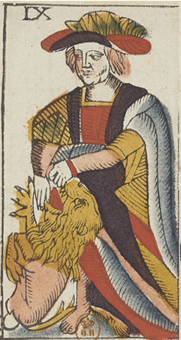 For centuries, the allegory of Fortitude has been depicted as either a woman and a lion, or a woman with a pillar. These two block printed tarot cards from the late 15th century are examples of each type. The Budapest card on left is unique in showing a man rather than the standard female allegory. This card probably illustrates the story of either Hercules or Samson wrestling with a lion. The woman on the right wears the scalloped halo of an allegorical figure, indicating that she is a virtue.