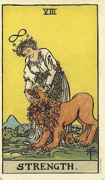 The Waite Smith card shown here adheres closely to Eliphas Levi’s description: a woman with an infinity sign over her head closing the mouth of a compliant lion. A chain of red roses and white flowers links woman and lion, and she wears the same flowers on her head.