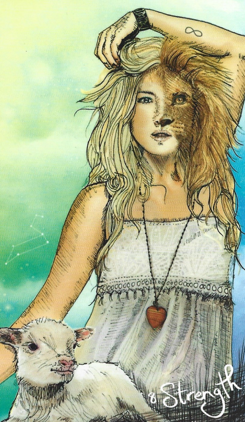 The woman in the Light Seers deck shape shifts into a lion. She has absorbed the lion’s strength and has nothing more to prove. She demonstrates the quiet, gentle strength that allows a lion to show compassion for the little lamb.