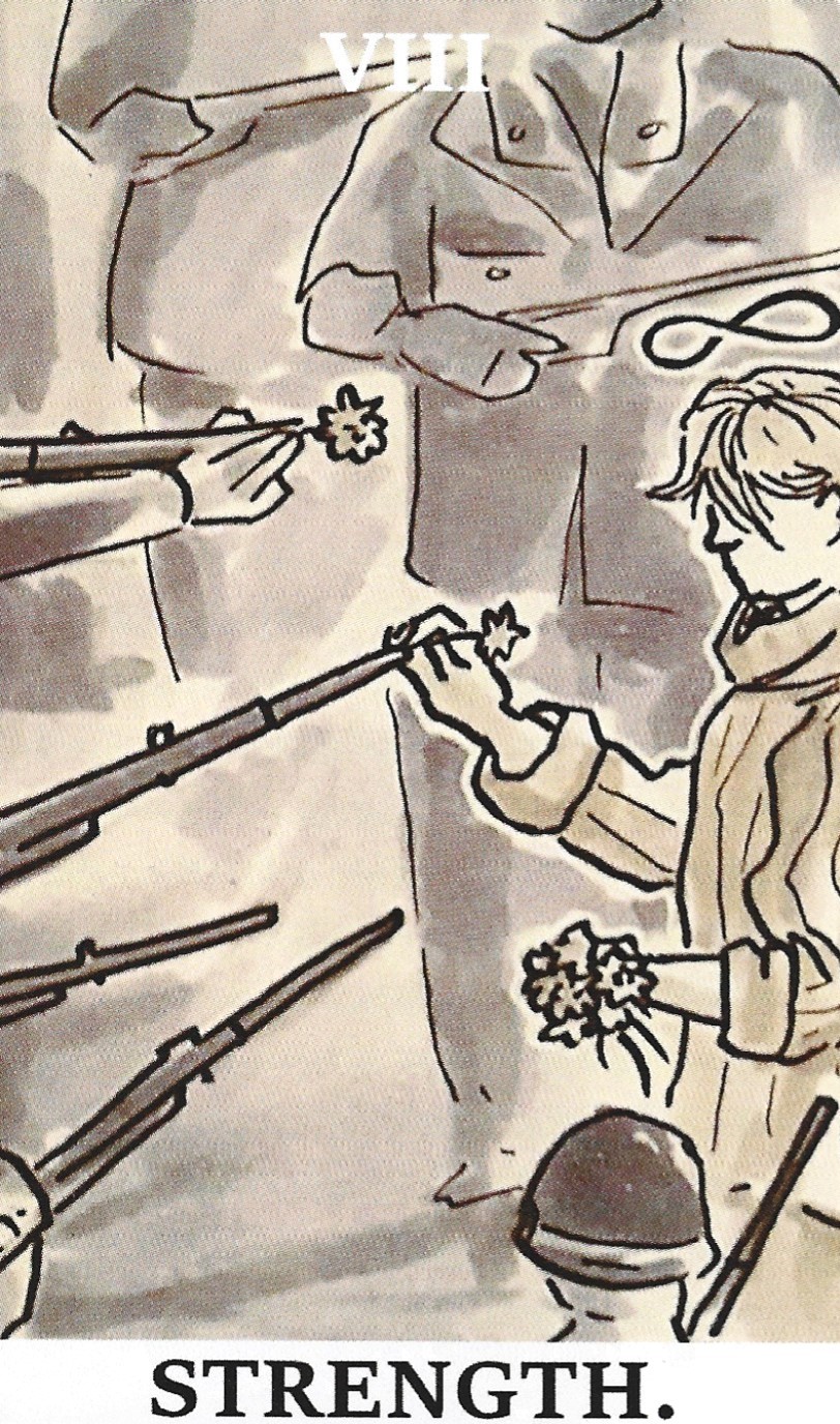 The Viet Nam war protester in the Ink Witch tarot puts flowers in the muzzle of a National Guard gun. During the culture wars of the Viet Nam era, protestors were deemed anti-American and put their lives on the line to protest in public. This image brings to mind the famous photo of a man standing alone in front of tanks in Tiananmen square, an icon of fortitude.
