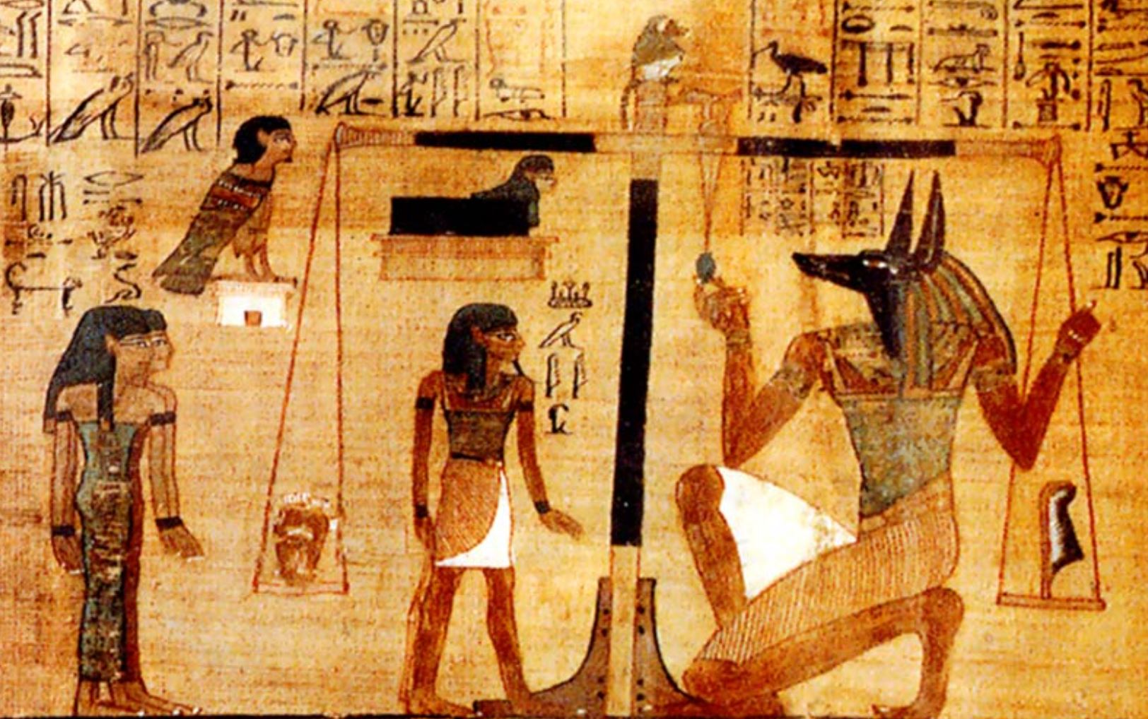 Anubis weighing a heart against an ostrich feather. Egyptian Book of the Dead