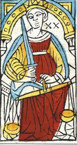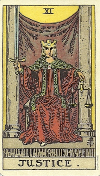 Justice has always been seen as a function of the government and the legal system. The Justice card can indicate anything related to the judicial system and social control, such as jails, the police, lawyers, bail bondsmen, city hall, and the bureaucracy. When the card turns up in a reading about a legal matter, it may give assurance that justice will prevail and the verdict will be fair. But it could also mean that the letter of the law will be upheld in a cold, impersonal manner. The sword is a symbol of a clear-cut, impartial decision; but it’s also a weapon of retribution and punishment. Until the guillotine was invented, beheading with a sword was the preferred method for dispatching condemned aristocrats. Interpreting the Justice card in terms of personal qualities or states of mind is a very recent development that we’ll discuss below.
