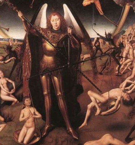 The Justice card from the late 15th century Budapest Tarocchi (left) is numbered 20, which places it between the Judgment and World cards. Justice is also in twentieth position in the earliest known list of trump cards, the Sermones de Ludo Cum Aliis (Steele Sermon), written about the same time the Budapest deck was created. The Angel in the Judgment card calls people to rise from their graves and proceed to the Last Judgment. According to popular Christianity, not the Bible, Saint Michael will be waiting for the newly risen souls with his sword and scales, ready to decide which souls will go to heaven, which will be turned over to the devil, and which will wait for the Last Judgment in Purgatory. Saint Michael in armor with a sword and scales, as in this 15th-century painting by Hans Memling, was a very popular motif in late medieval and Renaissance art. It seems the creator of the Budapest deck repurposed the allegory of Justice to stand in for Saint Michael in the final act of the tarot trumps.