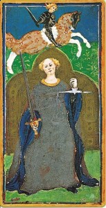 The Visconti-Sforza Justice card, created shortly after 1450, has a unique twist on the Last Judgment theme. Above the traditional allegory of Justice, a knight on a white horse wields a sword. This may be a reference to the book of Revelations in the Bible, Chapter 19:11: “And I saw heaven opened, and behold, a white horse; and he that sat upon him was called Faithful and True, and in righteousness he doth judge and make war.” In medieval society, knights enforced justice by hunting down wrong-doers and often meted out punishment on the spot.