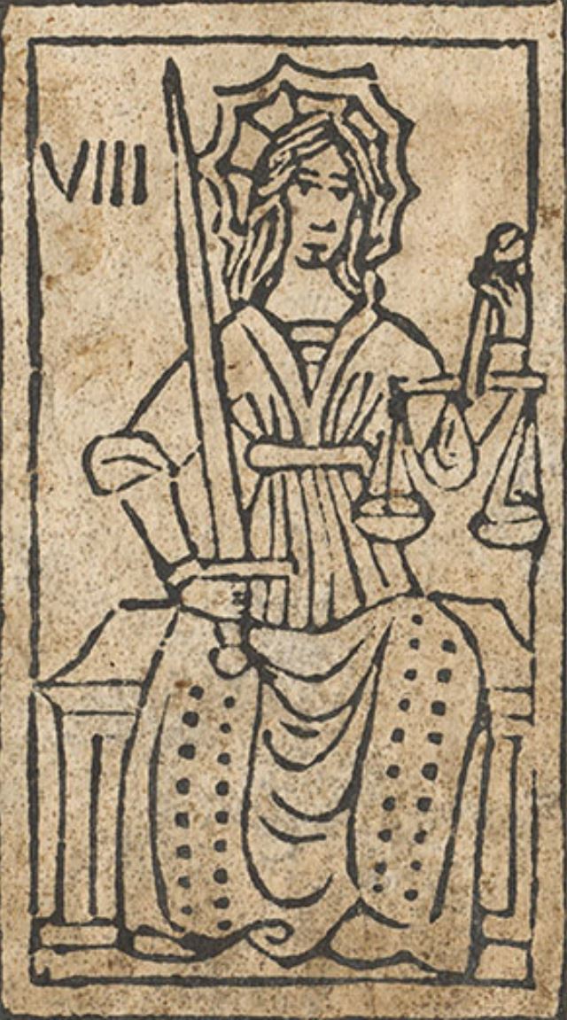 The earliest 15th-century tarot decks depict Justice as the traditional allegory with sword and scales. In these two decks, the hand painted Charles VI and the block printed Rosenwald Tarocchi, both figures wear a scalloped halo that identifies them as an allegorical figure.