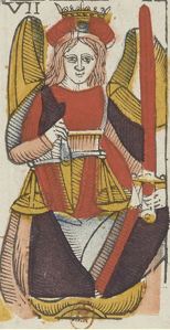 On the other side of France, in mid-17th century Paris, Jacques Vieville printed a deck that became the ancestor of the Rouën-Brussels pattern. The Vieville wings (left) are less butterfly like and seem to be evolving toward angel’s wings. In the 18th-century de Hautot tarot (right), the wings are completely angelic.