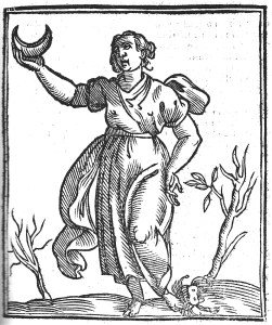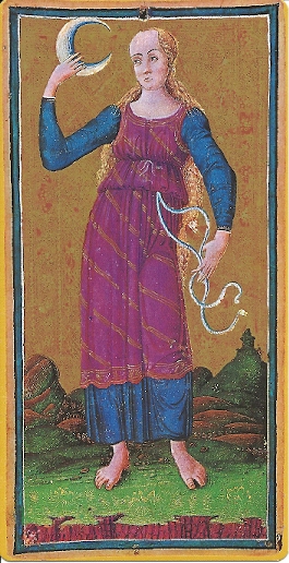 A few decks have unique Moon cards that appear nowhere else. The Visconti-Sforza Moon card shows the Roman goddess Diana, who roamed the forests hunting with a bow and arrows. She was the protector of women in childbirth and all animals, but she preferred solitude and was associated with chastity. She might be holding an unstrung bow on this card; but it appears to be attached to her gown, so it could be a white girdle, a symbol of chastity.