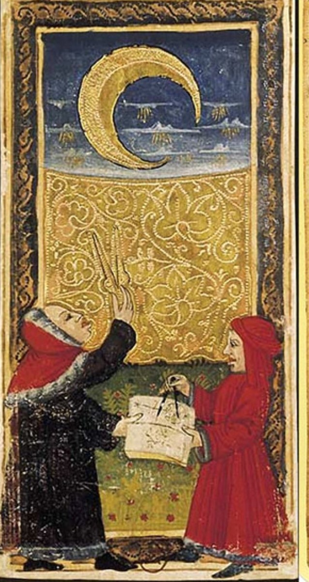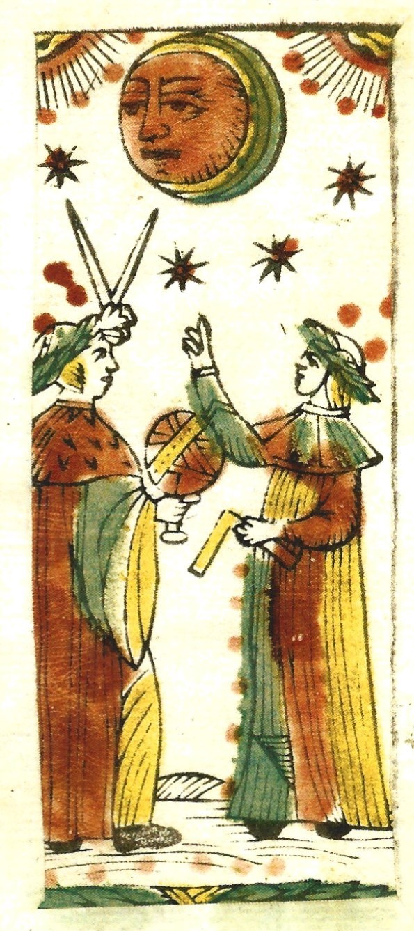 The oldest Moon card image, and the one that has endured the longest, depicts astrologers/astronomers with their measuring instruments looking up at a lunar eclipse; or in one case, bending over a desk. The cards left and center above were hand painted in the mid-15th century for members of Italy’s ruling class. The image on the right first appeared about 1500, and has been appearing unchanged on Bolognese Moon cards ever since.