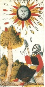 As noted in the article on the Three Celestial Lights, illustrations for the Star, Moon, and Sun cards are quite variable, and often gravitate from one card to another. Astronomers pointing up at the sky appear on the Star card of the hand painted d’Este deck. A young woman with a spindle and distaff is shown facing forward on the Sun card of a 15th century Italian deck, on a 16th century French deck, and on all Bolognese decks. But an elderly spinster appears in profile on the Moon cards of the French Vievil deck and its successors in the Rouën-Brussels pattern. She has been associated with Clotho, one of the three Fates who spin, measure, and cut the thread of an individual’s lifetime. But she might be a housewife taking advantage of the moonlight to spin yarn for the next day’s weaving. Or perhaps she’s a witch spinning a magic spell under the full moon. The Vievil is one of the earliest decks to depict a moon facing front with large rays emanating around it, like the Tarot de Marseille Moon cards discussed below.