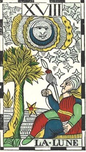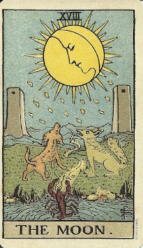 The British occultists of the Hermetic Order of the Golden Dawn shared the French view that this card represents delusion and mental error; then they added the psychological dimension of personal demons and impulses repressed in the subconscious. According to A. E. Waite, the dog and wolf are the fears that arise when there is only reflected light to guide us on the path leading to an unknown destination. Waite shows the Moon’s face in profile, like the 18th century Tarot de Marseille Type II cards. Two sets of sixteen rays indicate that the life of the imagination is separate from the life of the spirit. Waite tells us the moon is looking down calmly and dispassionately on the drama in the landscape below. The crab wants to crawl out of the water and follow the path to higher consciousness, but it’s situation is hopeless. It will inevitably fall back into the primal waters of the unconscious.