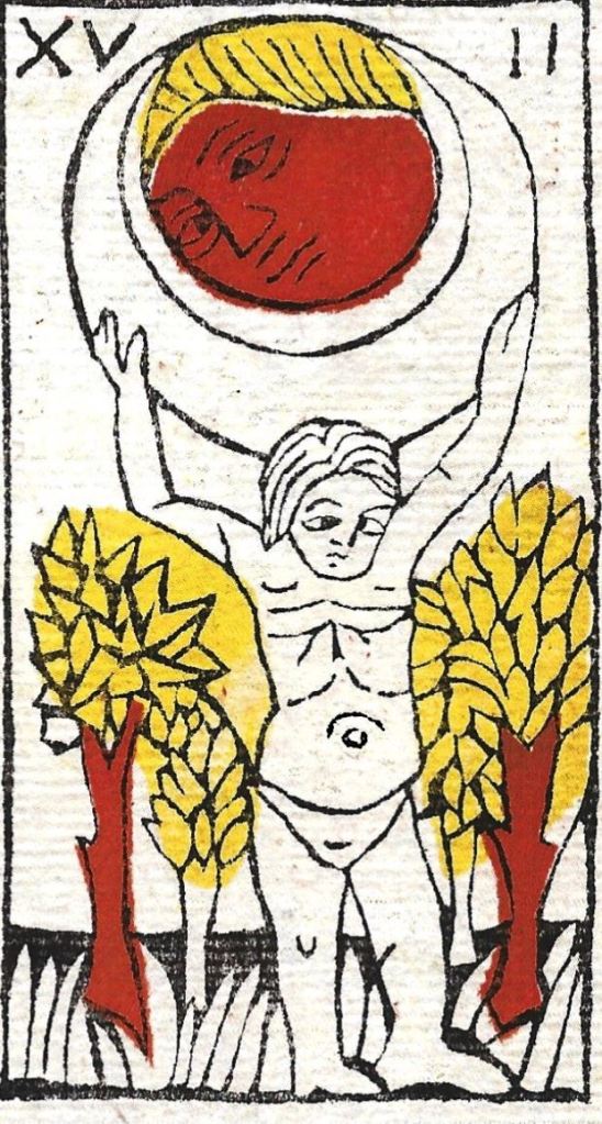 On the Budapest Moon card, a man seems to be sagging under the burden of holding up the moon. This brings to mind the mythic figure Atlas, who was condemned by Zeus to hold up the celestial globe for eternity.