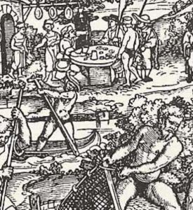 The woodcut shown here illustrates the Children of the Moon. As the ruler of the water sign Cancer, the Moon is the patron of all occupations involved with water: sailors, fishers, and millers who depend on water wheels. At the bottom right of the woodcut, a man hauls a fishing net, while another man stands in a shallow boat in the middle ground. Beyond the stream is a scene directly out of a Bagatto tarot card. Just as the Moon travels quickly across the sky, constantly changing as it goes, people whose occupation requires them to travel from place to place are children of the Moon. The Bagatto is doubly a child of the Moon because not only does he travel from town to town, but he cheats people with his card and dice games, and he practices deception with sleight-of-hand tricks.