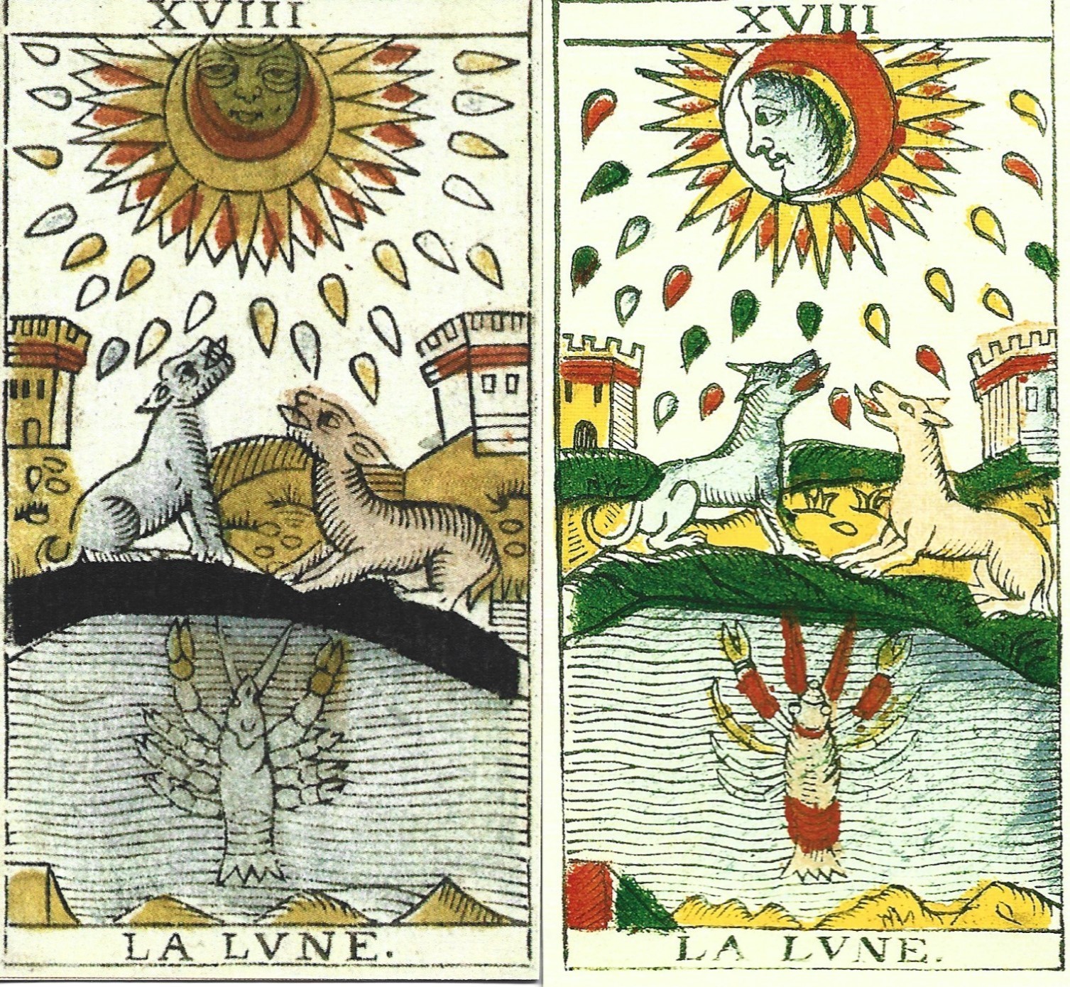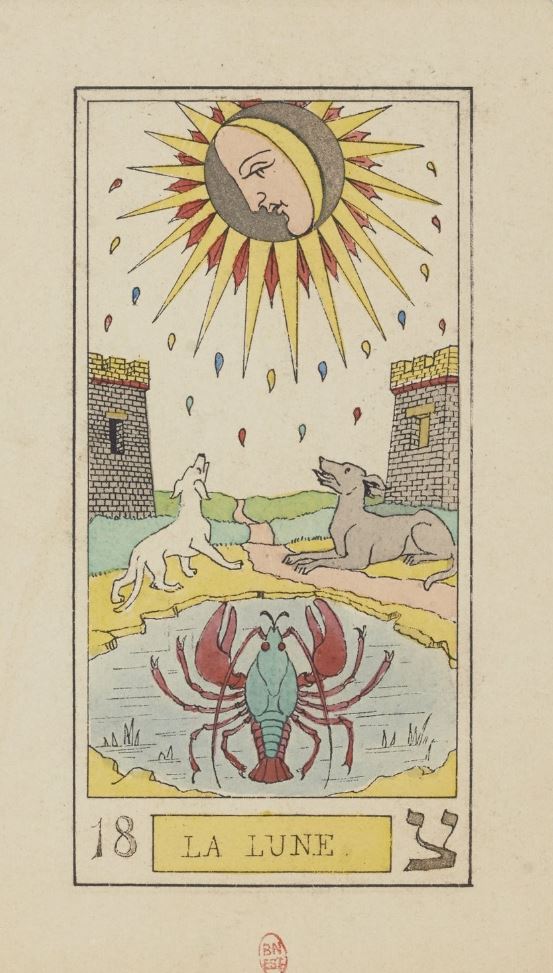 The French Tarot de Marseille offers an entirely new image of the Moon card, with unique features like dogs, towers and a crayfish.