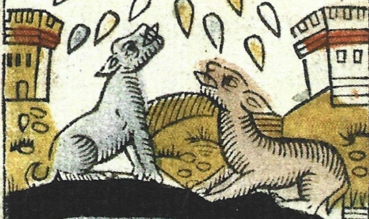 Since the Moon draws things toward itself, it should be sucking up the colored droplets and absorbing their vitality. But the dogs seem to be swallowing the droplets, which means they are falling from the sky. This detail is rather ambiguous, with no accepted interpretation.