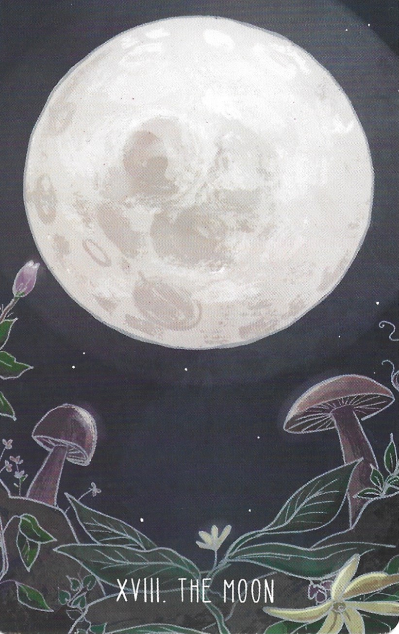 A giant moon illuminates an enchanted landscape in the Spacious Tarot. The petals of night-blooming jasmine unfurl in the moonlight and fill the air with their sweet scent. Magic mushrooms glow with an ethereal light, promising visionary, Alice-in-Wonderland experiences. The landscape is altered; nothing is what it seems to be in daylight. But this isn’t the occultist’s terrifying world of primal instincts and dangerous animals. It’s a gentle invitation to explore the enchanted realm of your own creative inner landscape.
