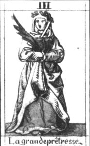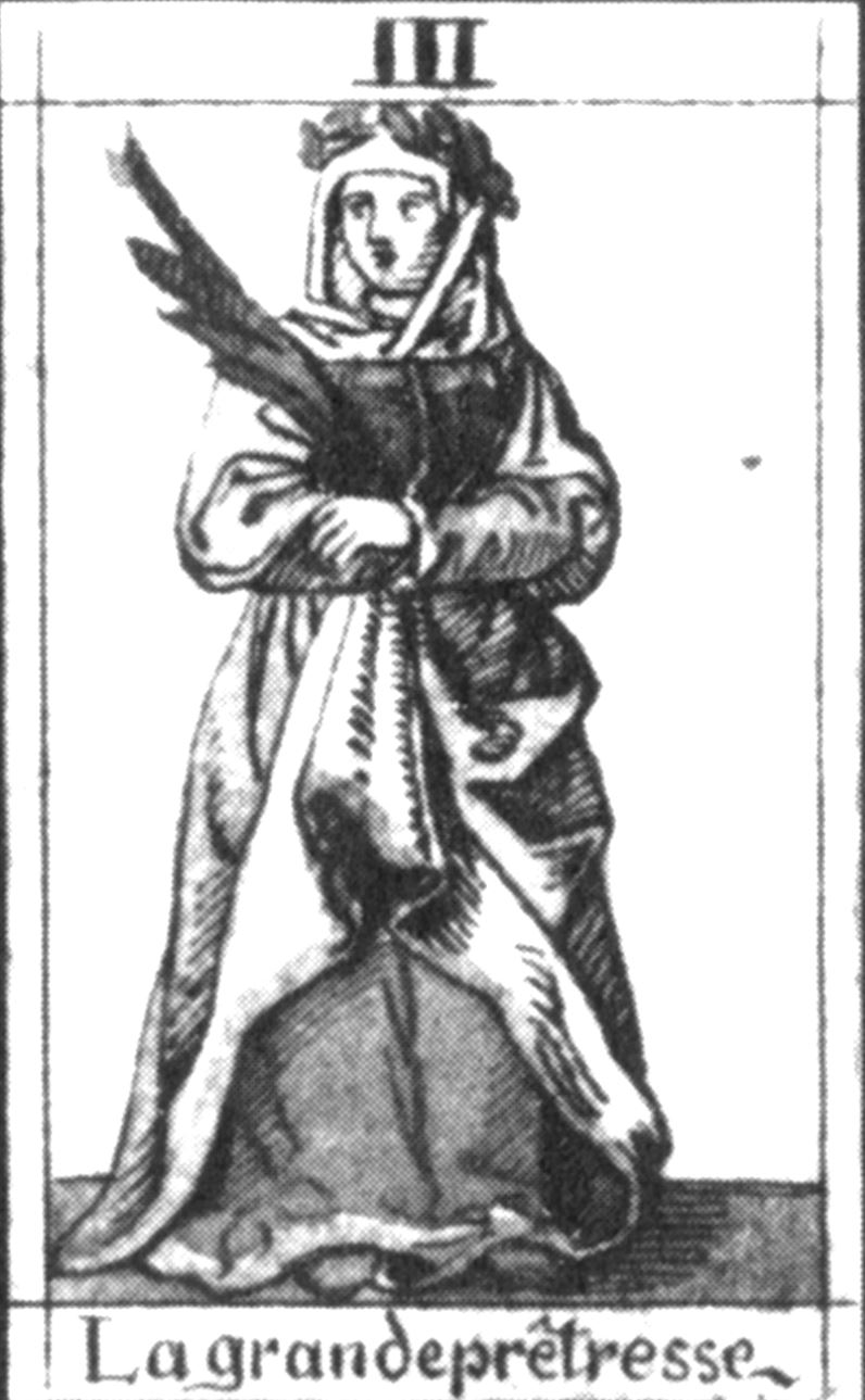 The greatest influence on the subsequent development of the Popess card was Eliphas Levi’s description in his 1856 book Transcendental Magic: “a woman is crowned with a tiara, wearing the horns of the Moon and Isis, her head enveloped in a mantle, the solar cross on her breast, and holding a book on her knees, which she conceals with her mantel.”