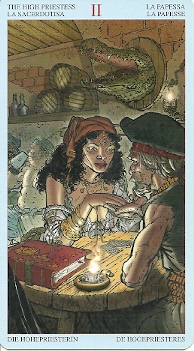 The tavern fortune teller in the Pirate’s Tarot has mesmerized her client with her supernatural powers and her other attributes; although the crocodile on the wall doesn’t seem nearly as impressed. The tools of her trade, cards and grimoire, rest on the table with this down-to earth, working class sorceress.