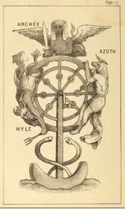 “…the cosmogonical wheel of Ezekial, with a Hermanubis ascending on the right, a Typhon descending on the left and a sphinx in equilibrium above, holding a sword between his lion’s claws.”
