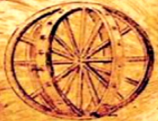 Ezekial’s Wheel appears in Ezekial chapter 10 of the Bible, which describes the vision of a Jewish priest during the Babylonian captivity. Ezekial saw in the sky four sets of four wheels within wheels, sitting at right angles to each other, and covered with eyes, so they could move in any direction in response to God’s will. These wheels accompany four cherubim with four faces each – that of a man, cherub, lion, and eagle. These creatures also appear in Revelations Chapter 4 verse 7, surrounding a throne in the sky. The early church associated these figures with the four evangelists: Matthew, Mark, Luke, and John, but changing the man to an ox. They were also associated with the four fixed signs of zodiac: Leo, Scorpio, Aquarius, and Taurus, as well as the four elements: earth, air, fire and water. They also appear in the four corners of the Tarot de Marseille and later World cards.